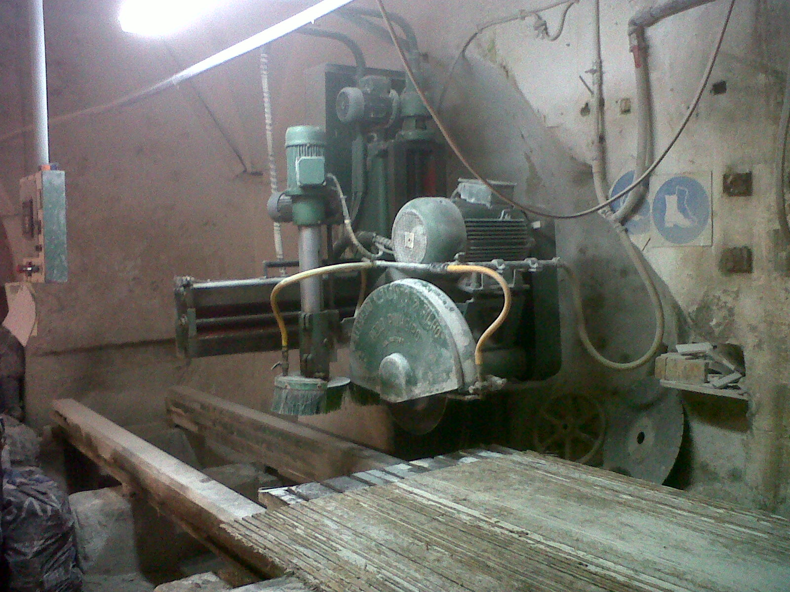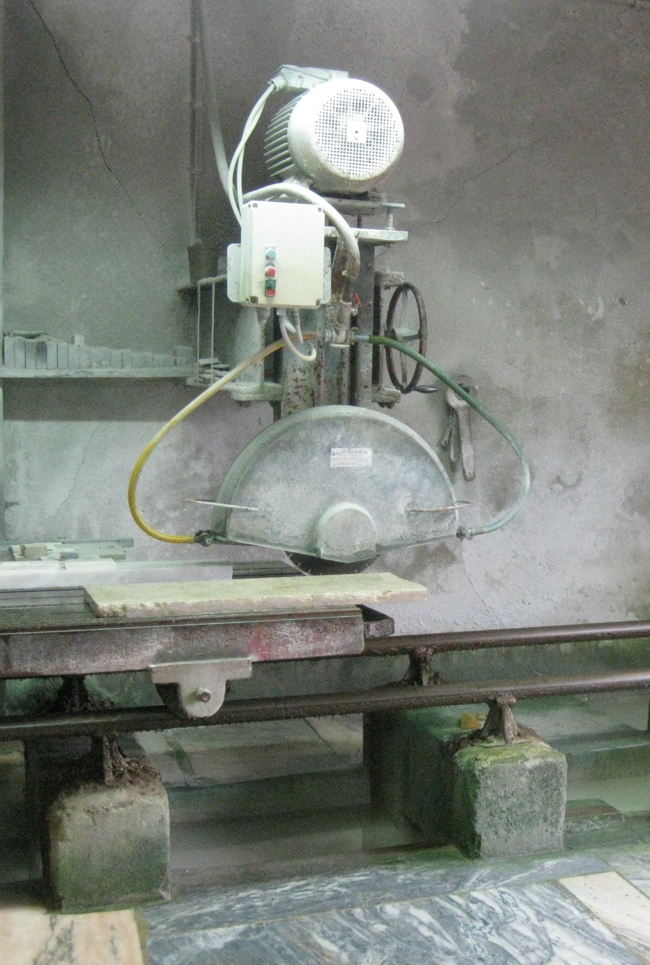 brilho e os acabamentos. A operação começa pela máquina de corte com charriot - um apoio onde a pedra assenta e que se desloca debaixo da lâmina circular de corte. «O diamante é para o granito e para o mármore. E a lâmina de corte já é como que "oca" não faz barulho como fazia antigamente, só se ouve o motor». Em volta da roda, nos dentes, está um reforço em diamante (de cor dourada e denteada). O disco "come" meio centímetro pelo que a espessura mínima de corte é de 1 cm. «No polir são rodas que prendem 4 calços que vão do nº 1, o que desbasta mais, ao nº 4, o que menos desbasta» explica o sr. Antonio Rosado dos Mármores Bom-Fim apertando esses calços ao disco, segurando com uma mão o manípulo que orienta a máquina de polir ou de polimento e com a outra mão dirige o braço da máquina, suspensa sobre as pedras, vai correndo o polimento ora ao comprimento, ora em transversal, sempre com água corrente, a qual arrasta o pó fino que sai desta operação.