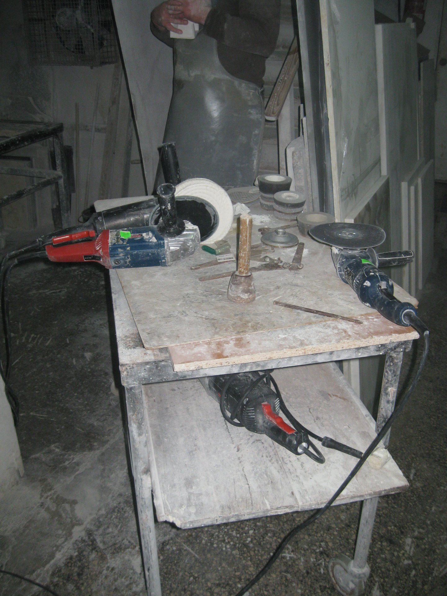Para os acabamentos usa a rebarbadora, sendo os outros acabamentos possíveis abrir orifícios para tubos e canos, picar, bojardar, gravar letras, marcas ou desenhos. «Antes havia um homem na máquina de corte, outro na de polir e outros nas bancadas, mas agora todos fazemos um pouco de tudo, dado as encomendas de hoje serem poucas e pequenas, já não há encomendas para prédios de raiz, só para algumas remodelações, pedras de lava-loiça, escadas, forros para casa de banho, mas revestimentos de paredes em pedra já não se fazem pois ficam mais caro», acrescenta o Sr. Antonio Rosado .